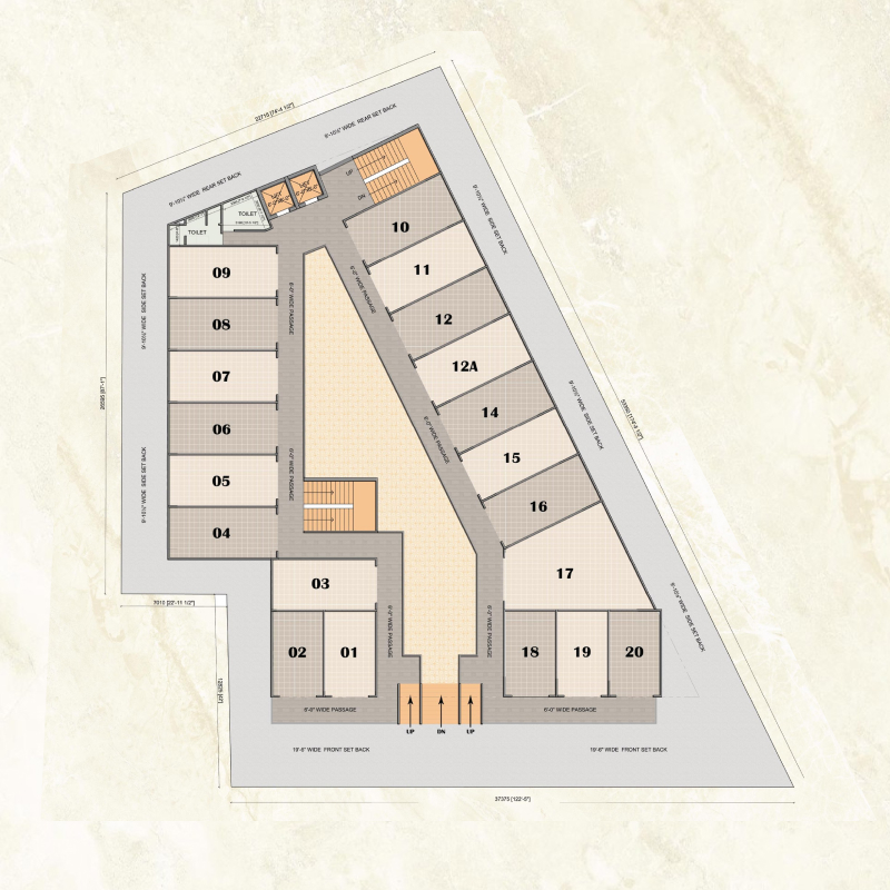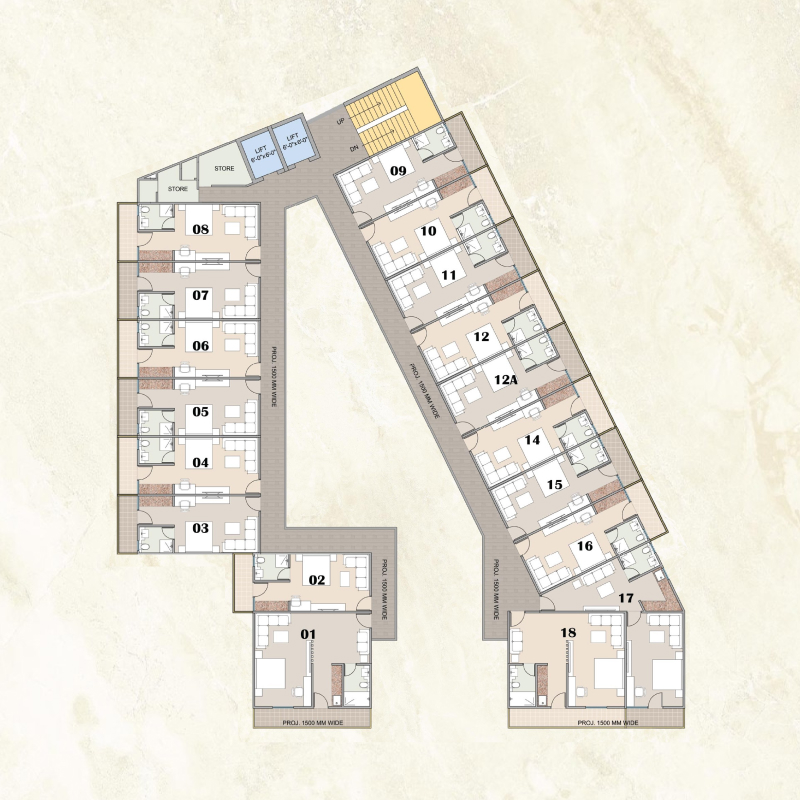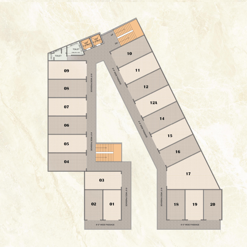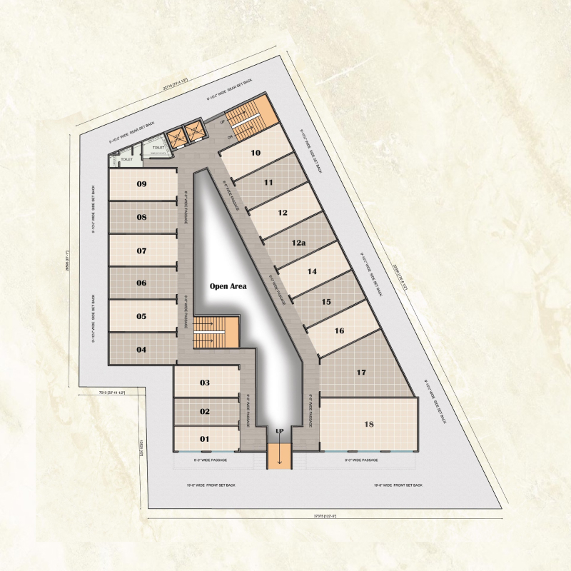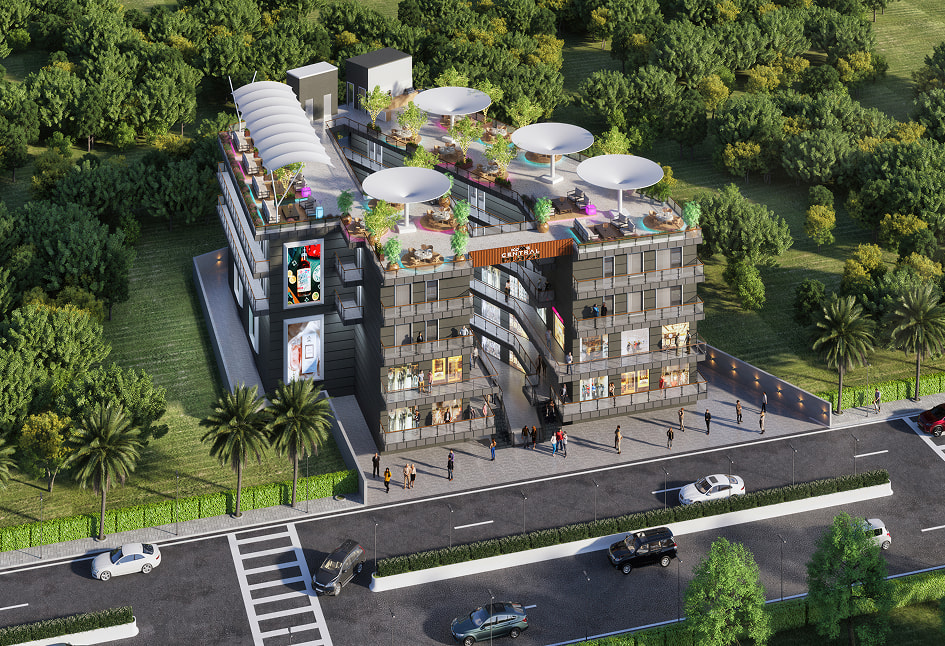 A sleek blend of contemporary lines and traditional elements, creating an inviting and visually appealing ambiance. - Materials: Glass shopfronts for a premium look. Exterior sprayed finish with texture paint. Vitrified tiles/stone flooring for shops, suites, and corridors.